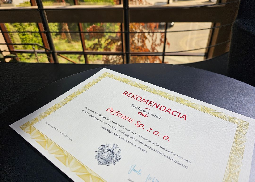 Z dumą informujemy, że firma Deftrans została członkiem Business Centre Club – jednej z najbardziej prestiżowych organizacji biznesowych w Polsce. To dla nas nie tylko wyróżnienie, ale również krok w stronę jeszcze większej transparentności, jakości oraz odpowiedzialności w prowadzeniu działalności – zarówno na rynku krajowym, jak i międzynarodowym.
